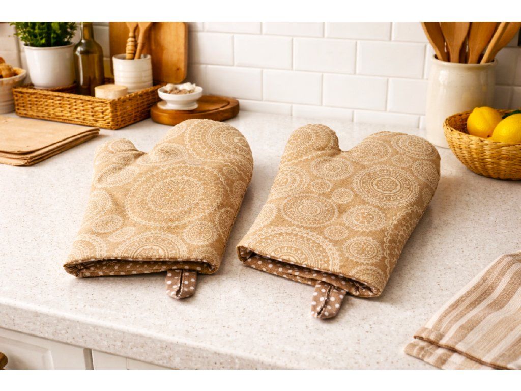 set 2ou chňapek z krásné režné béžové látky se vzorem mandal, uvnitř béžové bavlněné plátno s bílým puntíkem