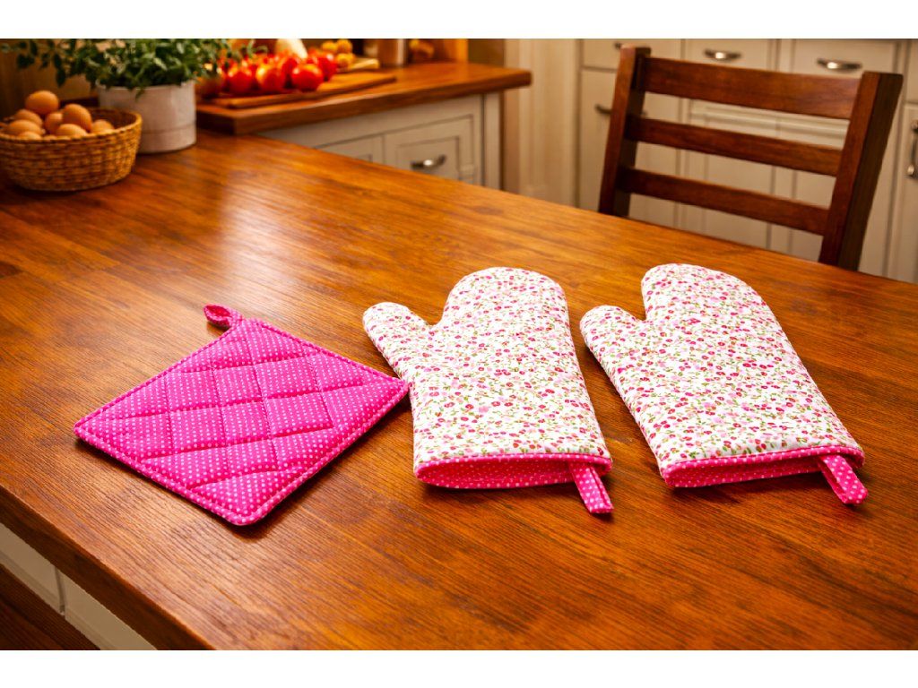 Ručně šité chňapky i podložka z krásné růžové látky s jemnými kvítky a puntíky, dvojitá vrstva látek s výplní, poutka na pověšení.