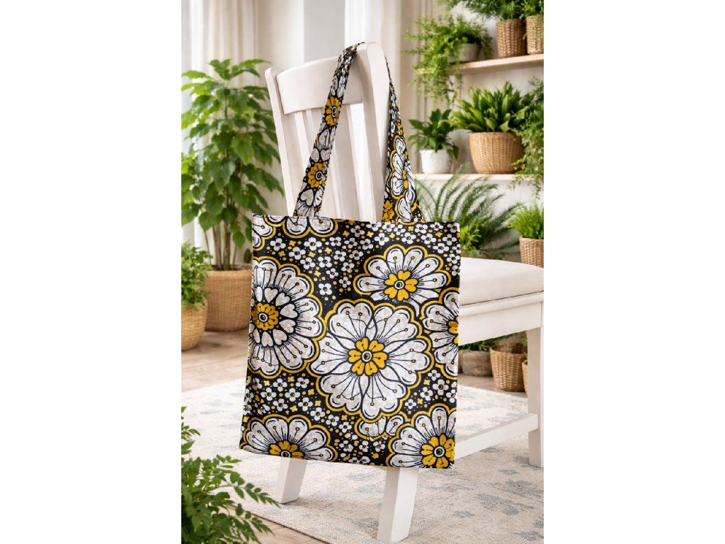 Ručně šitá látková taška z kvalitní africké látky dovezené přímo z Beninu. Díky velmi odolnému materiálu je pevná, spolehlivá a bez problémů unese i těžší nákup. Každý kus je originál s příběhem Afriky.