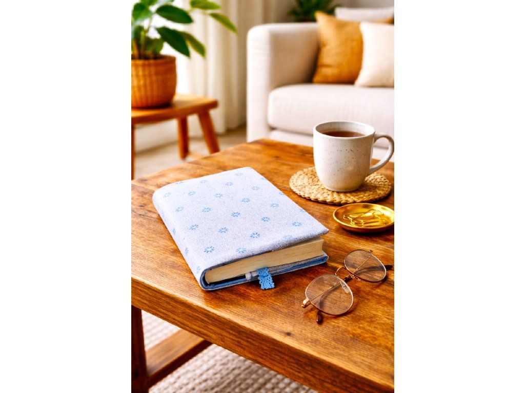 Překrásný látkový rostoucí obal na knihy. Ušitý z překrásné látky s modrými kvítky. Je z třívrstvého materiálu, uvnitř všitý termolín.